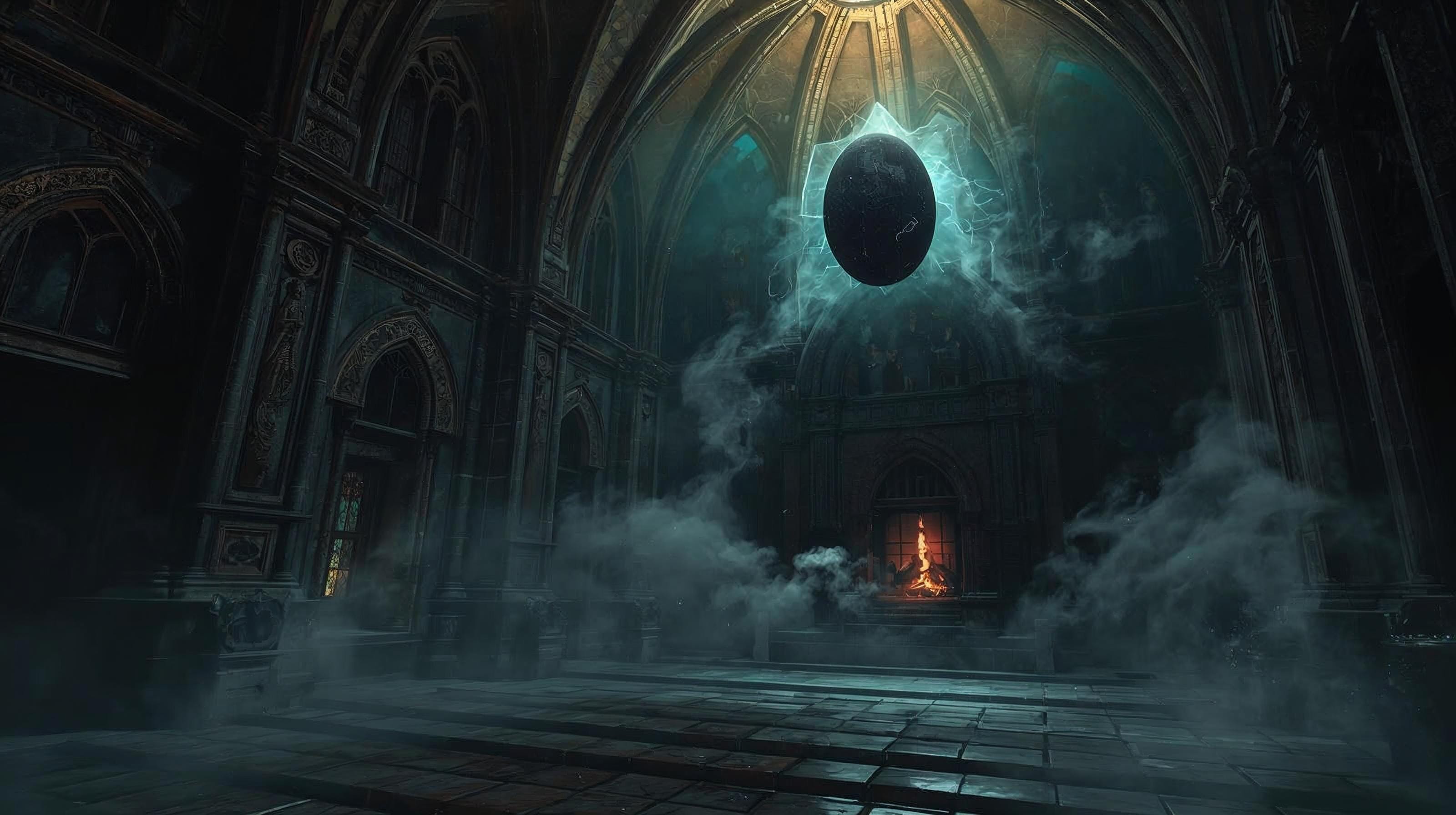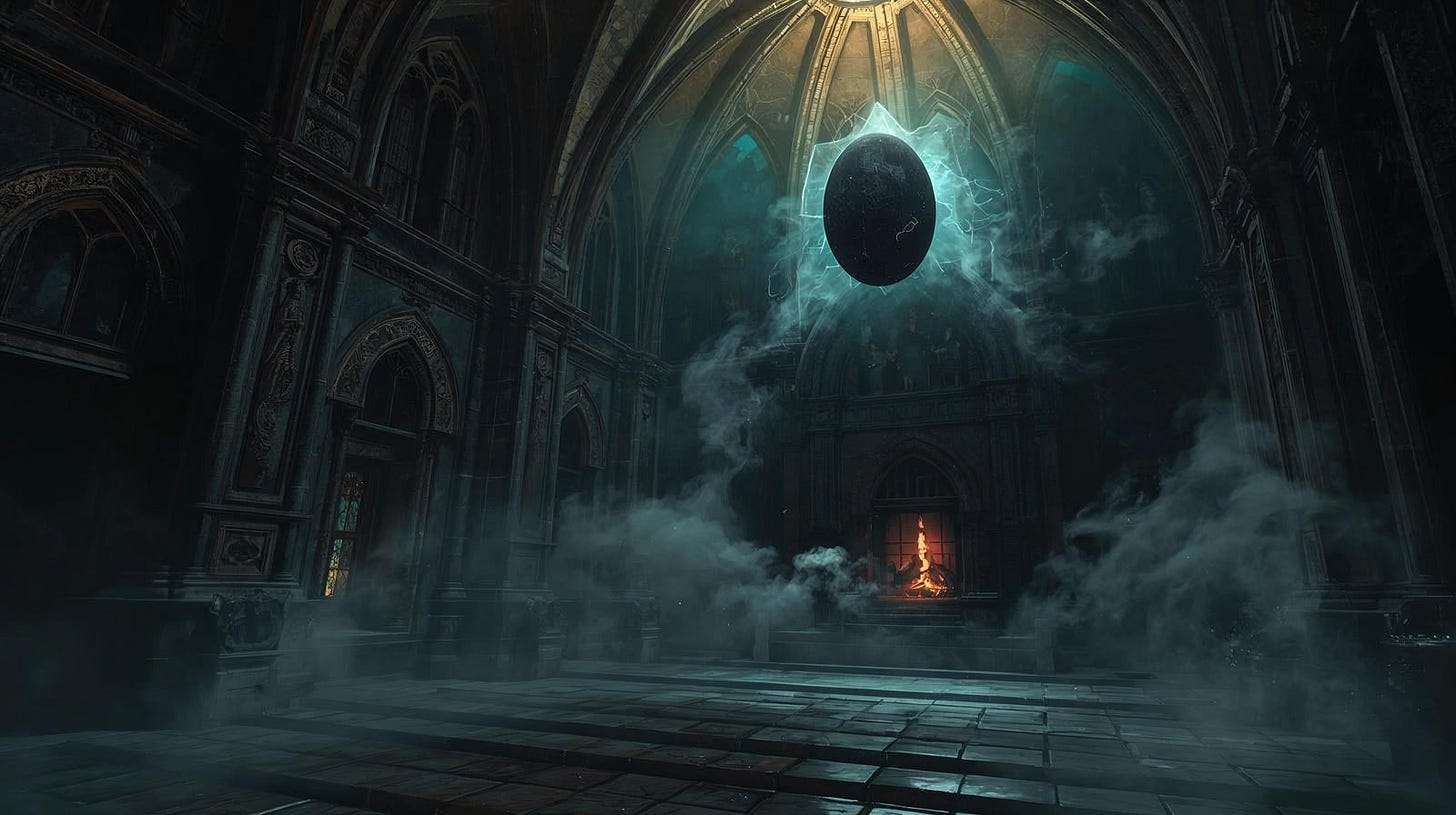 Rahorh and Abigail burst in right after. Their hands were holding torches that radiated white light that beat the black smoke deep into the throne room. Ianc gazed inside, his mind was so focused that time seemed to slow itself down. In the hall’s heart hung the orb, a pulsing, diseased egg. Gray tendrils dripped from it like roots, piercing through the nobles of Camelford, now dangling marionettes of death. They twitched with each pulse, puppets to the orb’s black magic.